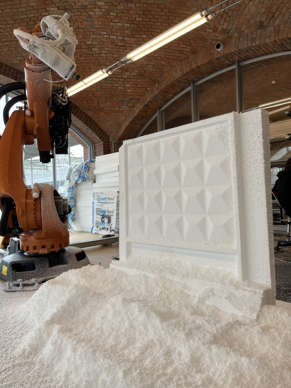 Software /// technology 3d modeling -> RhinoCeros 3D milling method -> KUKA robot + Grasshopper + KUKA prc mapped graphics -> TouchDesigner